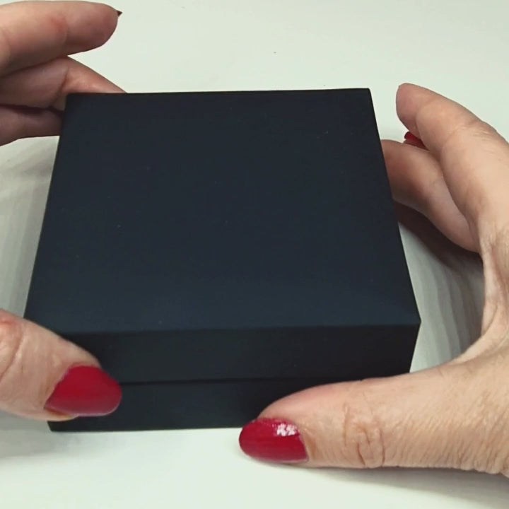 - Black Flip Box: The lid is covered with buckram paper and lightly textured while the base of the box is made of smooth black kraft paper. A hidden magnet, located at the back of the base, keeps the hinged lid closed.