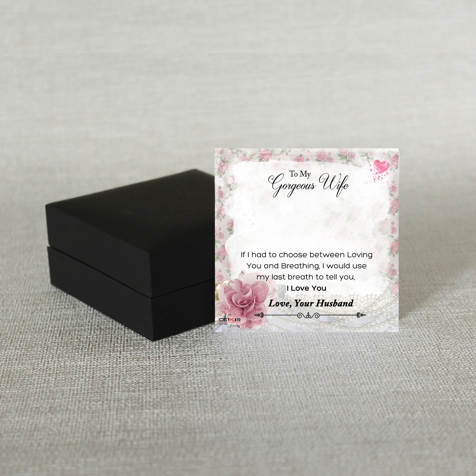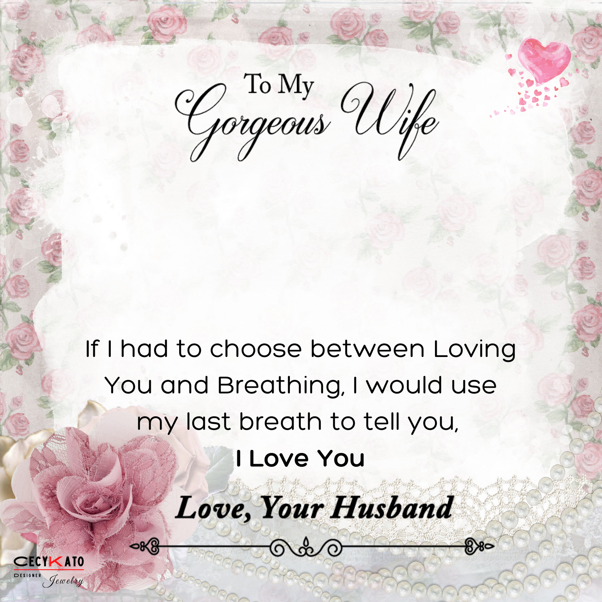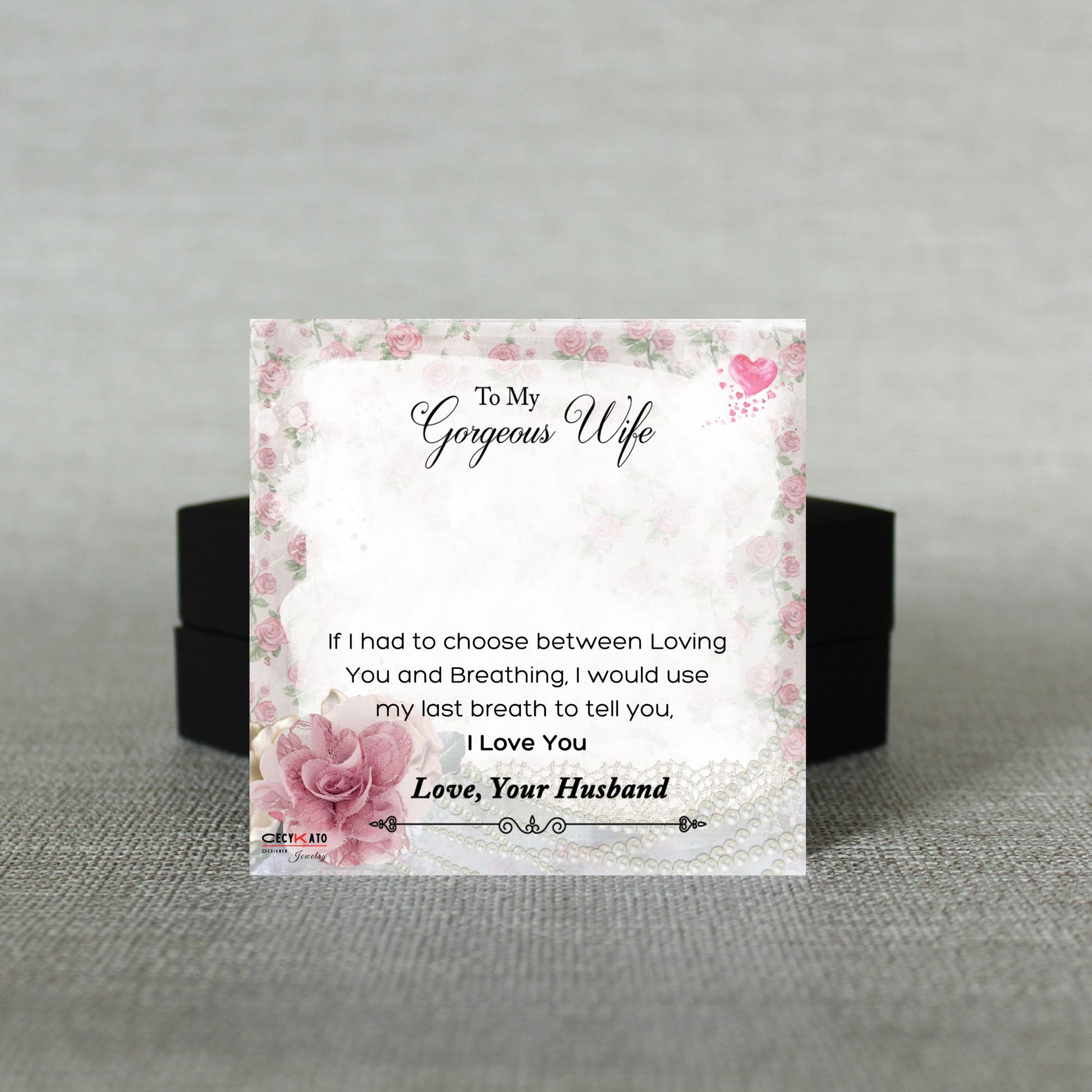 To my Gorgeous Wife Message Card is the perfect way to express your love. Featuring the romantic sentiment "If I had to choose between loving you and breathing, I would use my last breath to tell you, I love you," this card will show your special someone just how deeply you feel in the most beautiful and heartfelt way. This exclusive and tasteful card is sure to make their special day even more unforgettable.