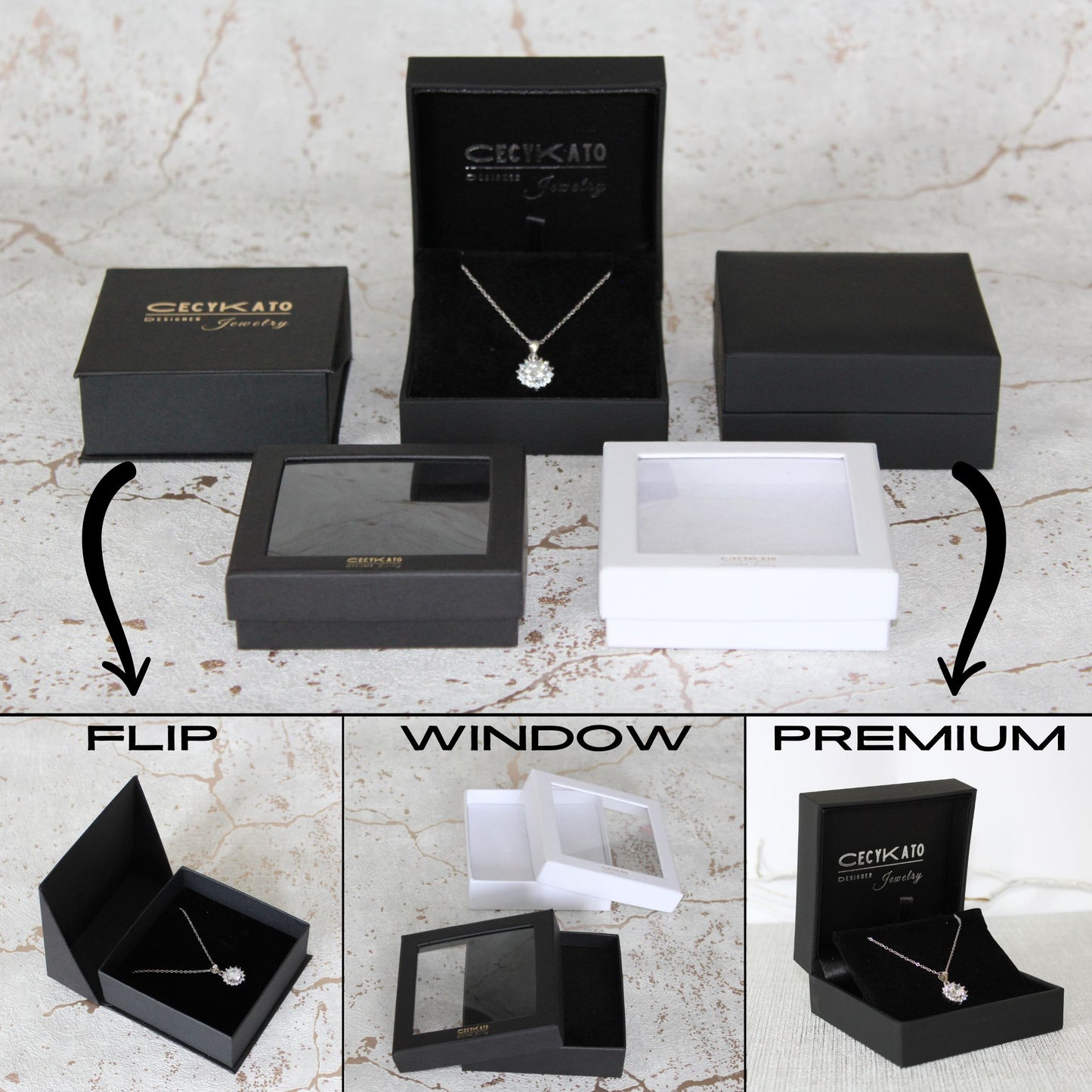 - Black / White Window Box: Beautiful cardboard jewellery box with a clear lid, and foam insert.