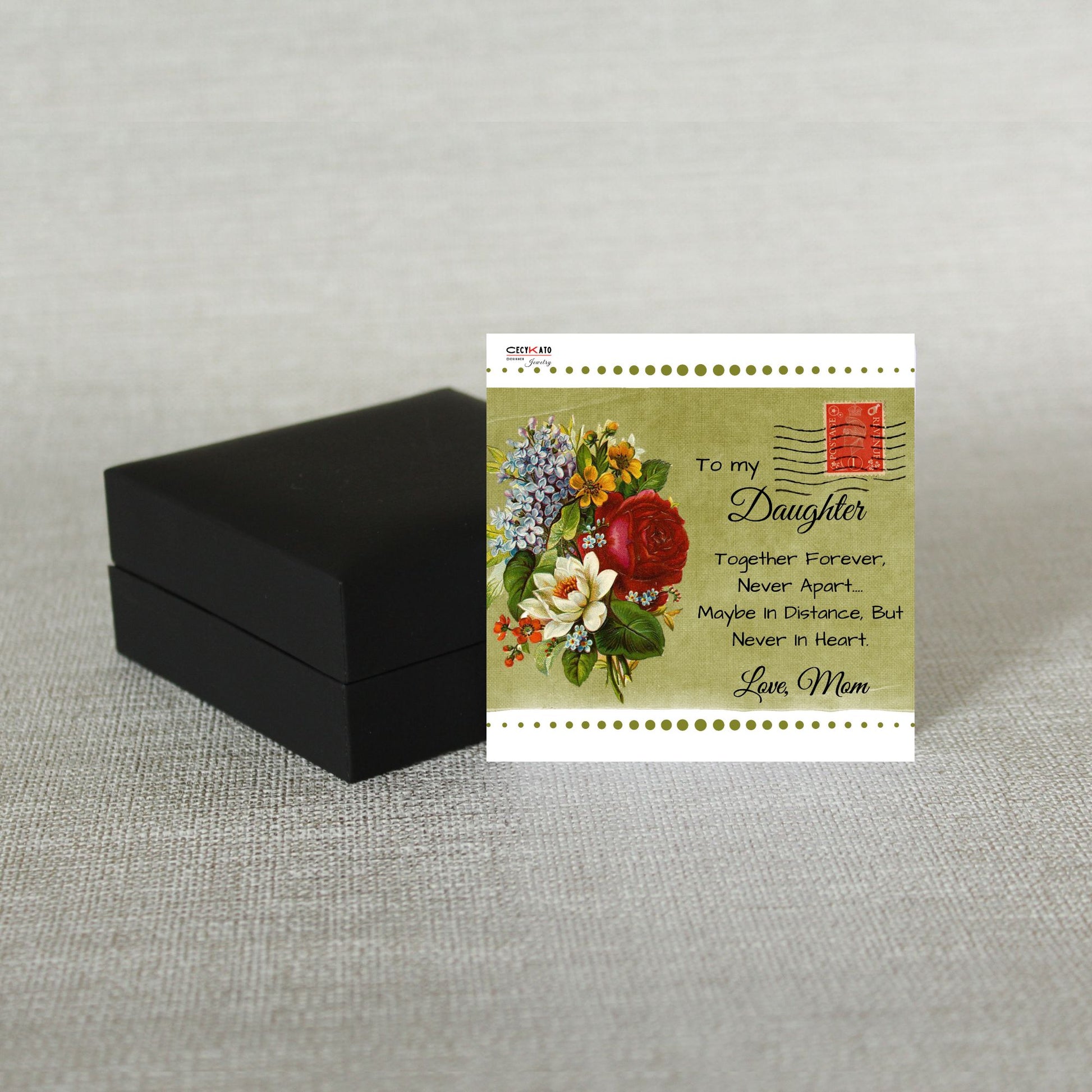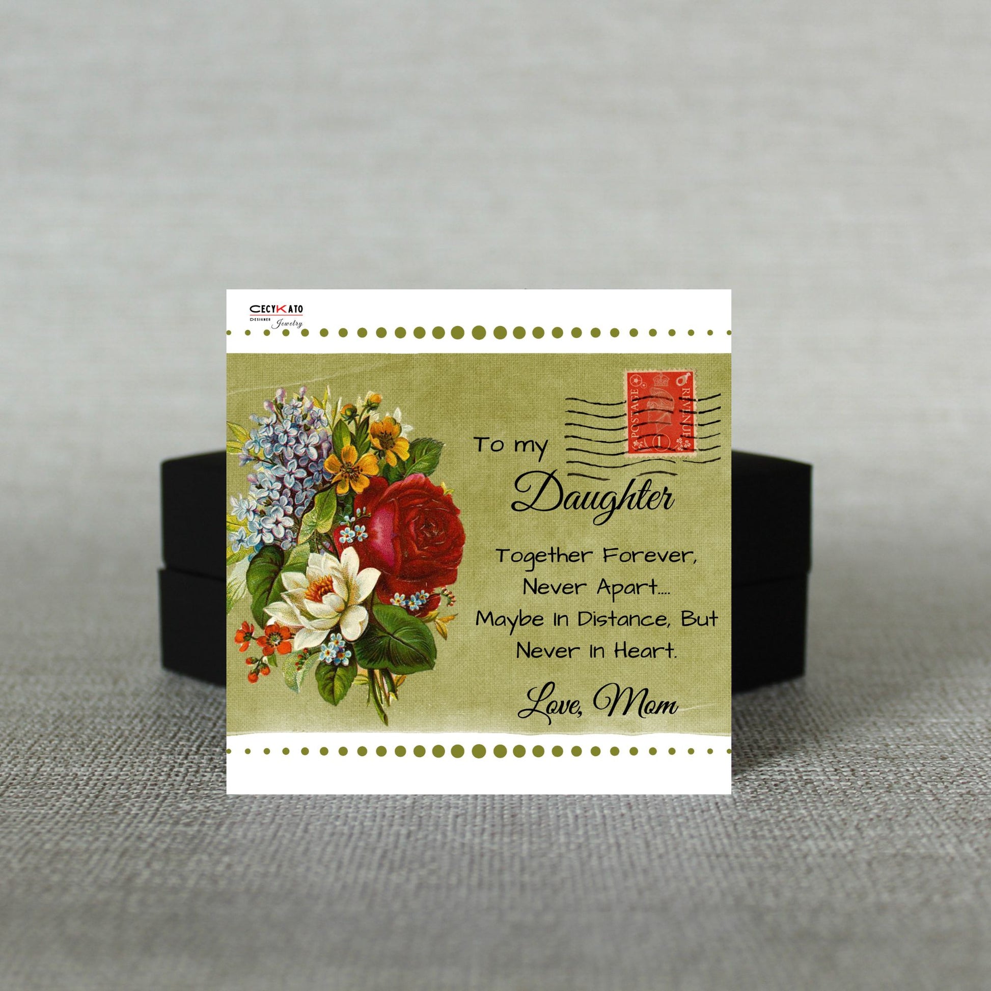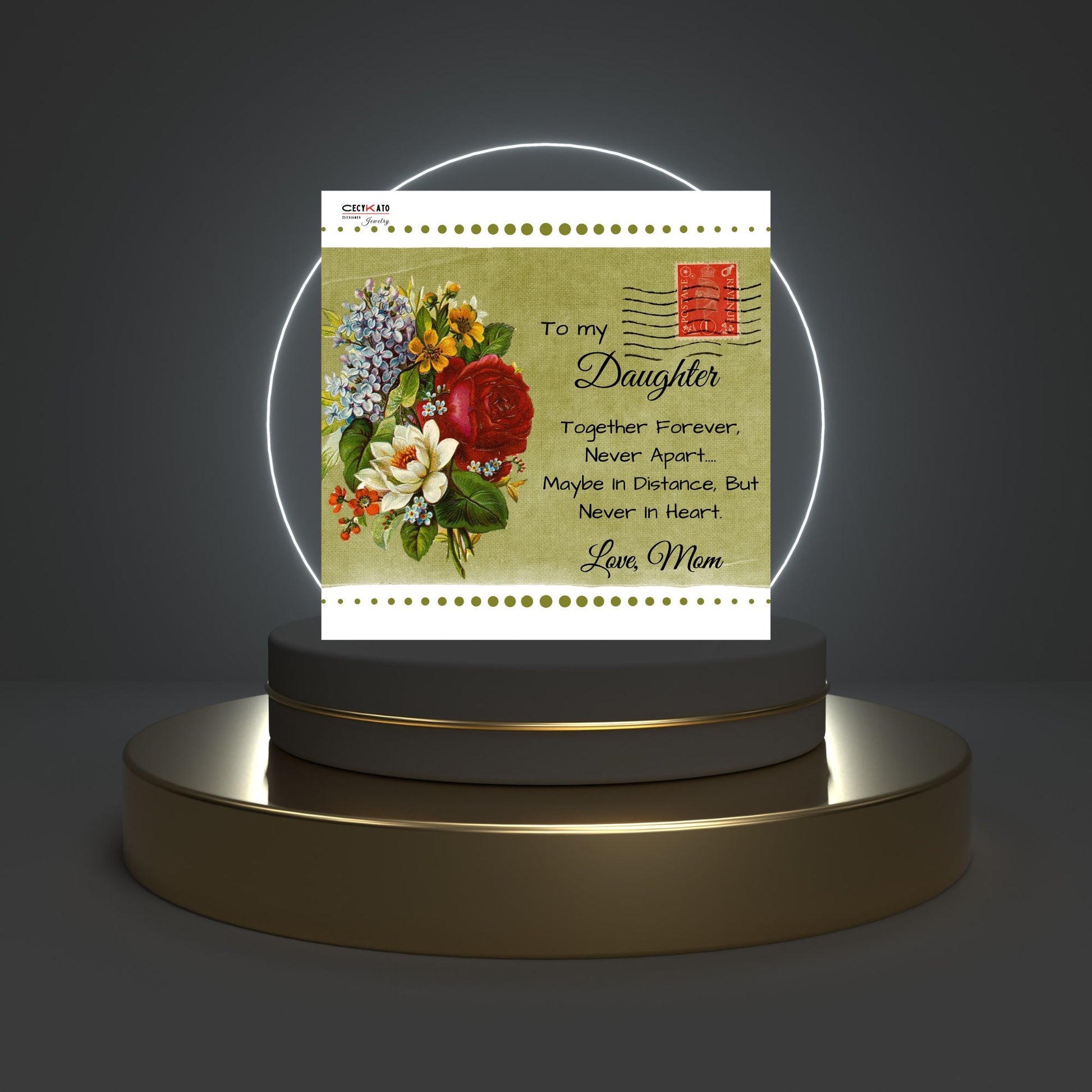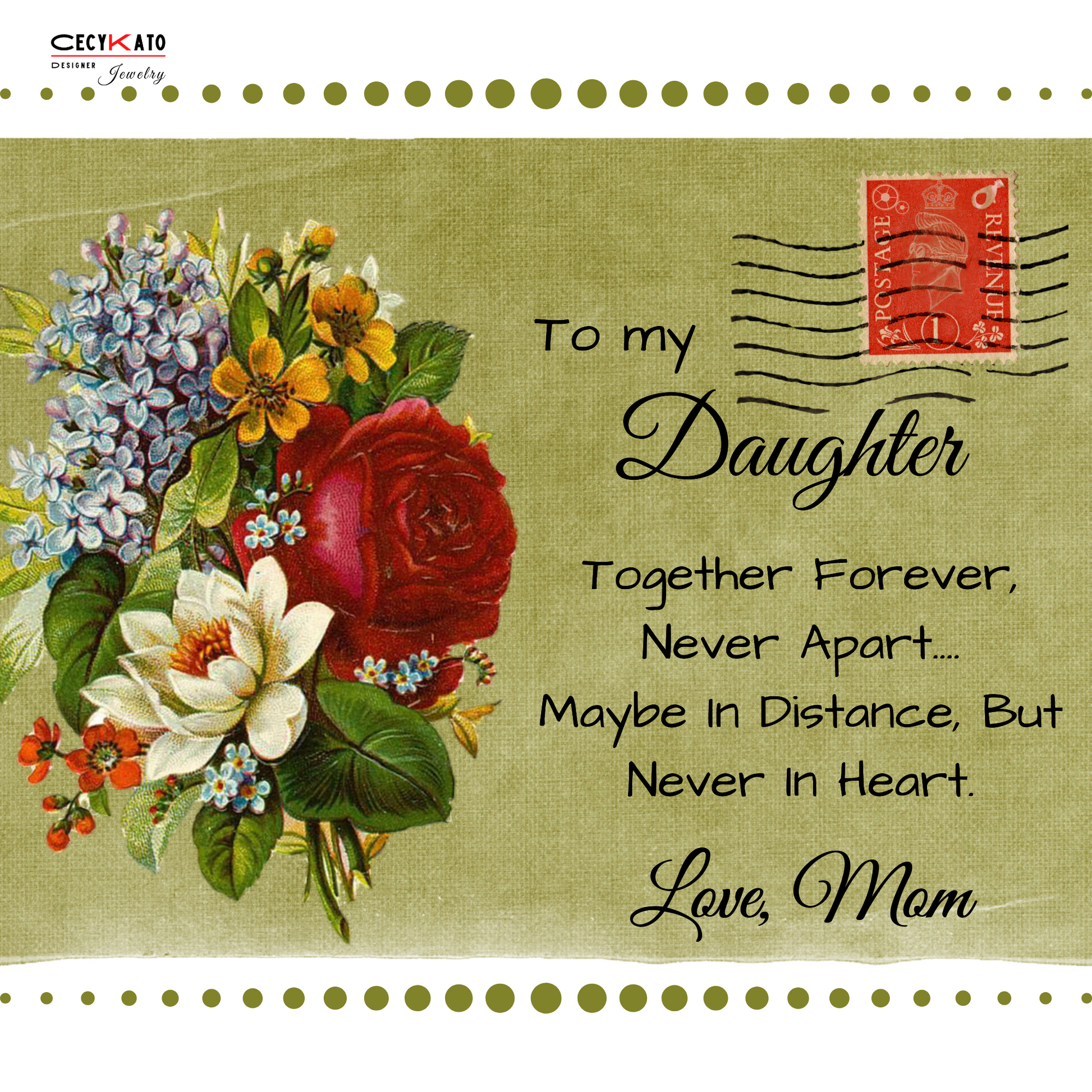 This beautiful To my Daughter Message Card is the perfect way to express how much you love and appreciate your daughter. The heartfelt message, "Together forever, never apart... Maybe in distance, but never in Heart," conveys the undying bond between a parent and their child, and makes for a special gift for any occasion. Show your daughter how much she means to you with this message card!