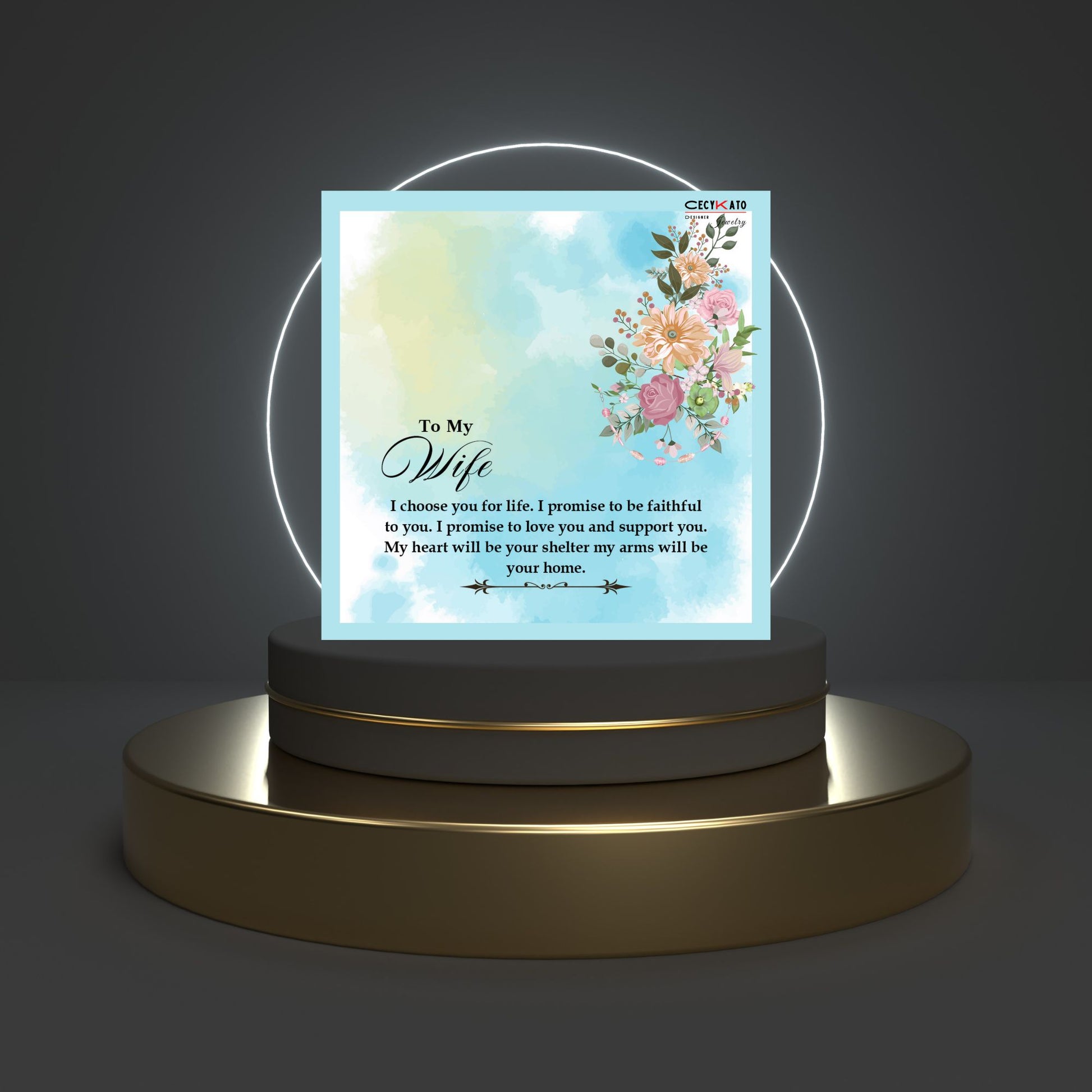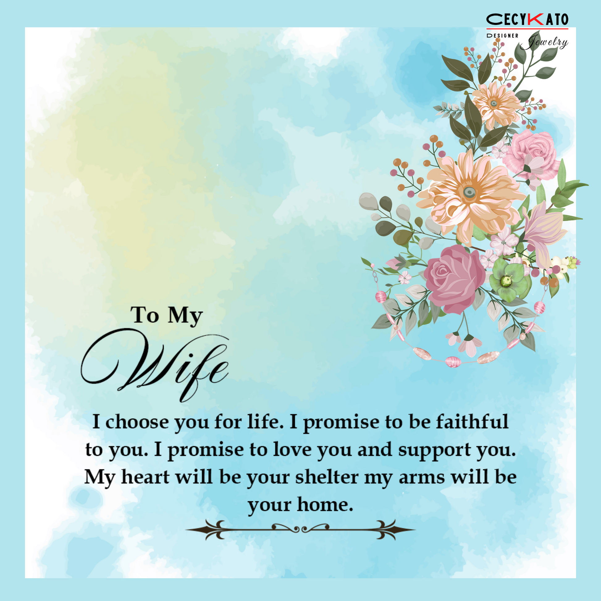 Card message: "I choose you for life. I promise to be faithful to you. I promise to love you and support you. My heart will be your shelter my arms will be your home."